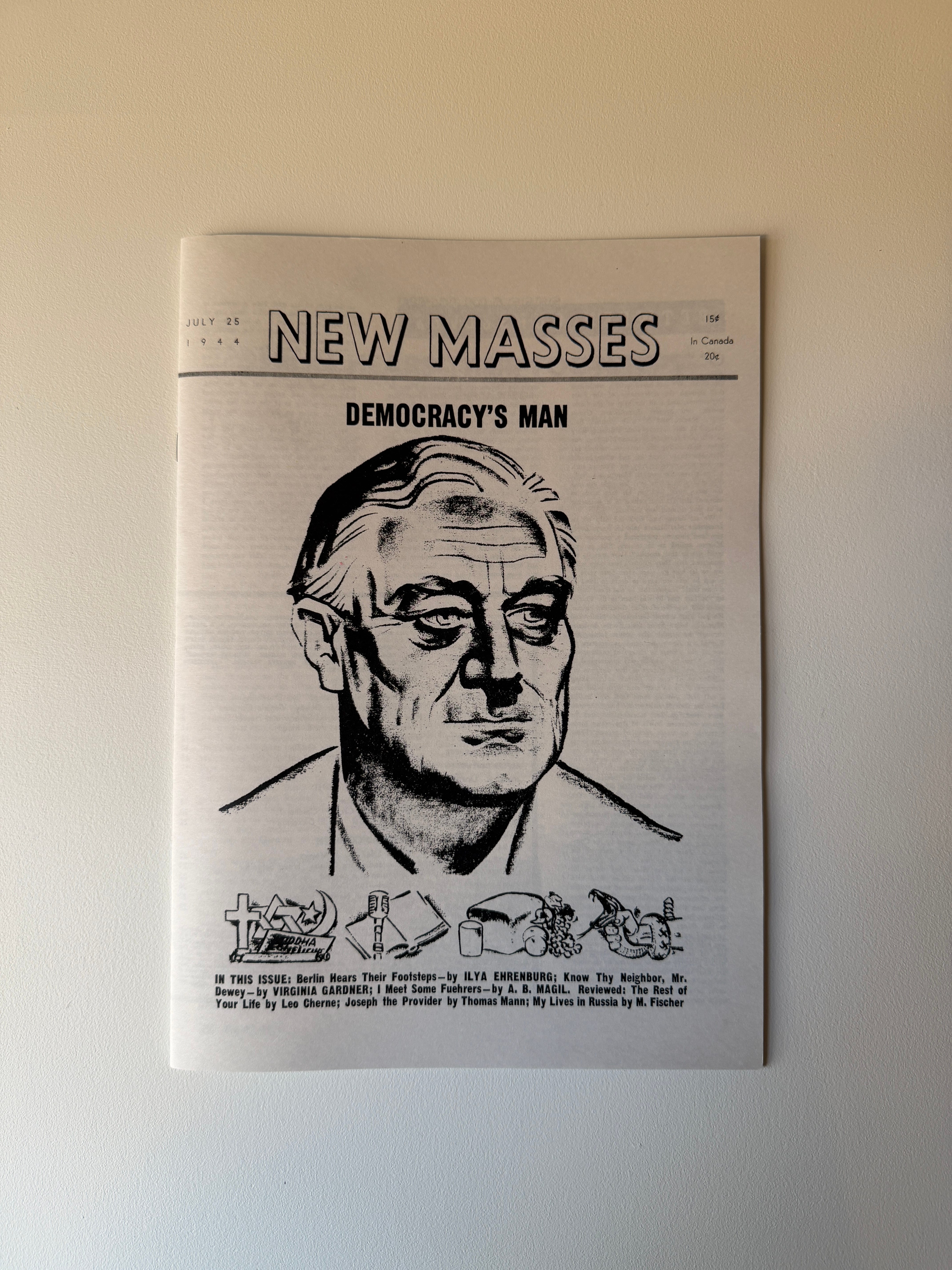 Long-time readers of Combat Threads will know that one facet of this project is to create one off objects and faithful reproductions. Like the reproduction WWII jungle sweaters or the reproduction Falklands War t-shirts I have done over the years. My latest is a bit different. I recently came across an amazing issue of the CPUSA-aligned magazine New Masses from July of 1944. The issue, the epitome of the broad popular front politics of the war years, is an endorsement of FDR’s 1944 reelection campaign. The cover is amazing, a striking woodcut portrait of FDR with each of his Four Freedoms represented below, and the cover line “Democracy’s Man” above. With an original issue in hand, I set about reproducing the whole issue and produced a small run of 20 professionally printed and stapled. Buy it for the amazing cover art and enjoy the entire issue, a window into the American Communist Party’s view of the war and American politics at the height of WWII. You can buy a copy here. These were really fun to produce, and I hope some of you will enjoy them as well.